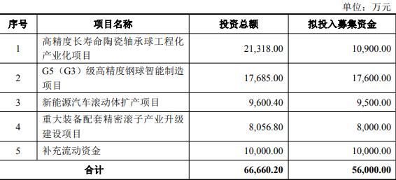本次向特定对象发行股票募集资金总额不超过56,000.00万元(含本数),扣除发行费用后的净额将全部用于高精度长寿命陶瓷轴承球工程化产业化项目、G5(G3)级高精度钢球智能制造项目、新能源汽车滚动体扩产项目、重大装备配套精密滚子产业升级建设项目、补充流动资金。