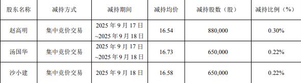 近日,公司收到股东赵高明、汤国华、沙小建出具的告知函,赵前述减持计划已实施完毕。赵高明于2025年9月17日至2025年9月18日通过集中竞价方式减持880,000股,减持比例0.30%,减持均价16.54元;汤国华于2025年9月17日至2025年9月18日通过集中竞价方式减持650,000股,减持比例0.22%,减持均价16.73元;沙小建于2025年9月18日通过集中竞价方式减持650,000股,减持比例0.22%,减持均价16.58元。经计算,3人共计套现36206700元。