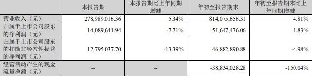 年初至报告期末,公司实现营业收入8.14亿元,同比增长4.81%;归属于上市公司股东的净利润5164.75万元,同比增长1.83%;归属于上市公司股东的扣除非经常性损益的净利润为4688.29万元,同比减少4.98%;经营活动产生的现金流量净额-3883.40万元。