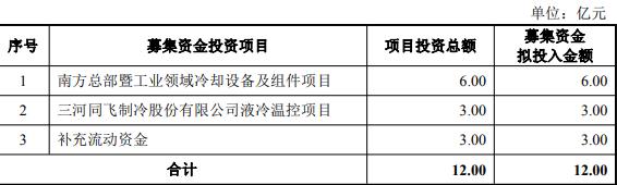 公司本次向特定对象发行股票的募集资金总额不超过人民币12.00亿元(含本数),扣除发行费用后的募集资金净额将投资于南方总部暨工业领域冷却设备及组件项目、三河同飞制冷股份有限公司液冷温控项目、补充流动资金。