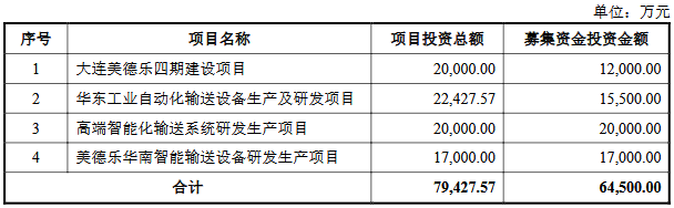 2026年1月19日,公司披露招股说明书显示,公司拟募集资金64,500.00万元,用于大连美德乐四期建设项目、华东工业自动化输送设备生产及研发项目、高端智能化输送系统研发生产项目、美德乐华南智能输送设备研发生产项目。