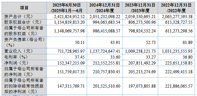 2022年至2024年,公司实现营业收入分别为10.31亿元、10.09亿元、11.38亿元,归属于母公司所有者的净利润分别为2.22亿元、2.05亿元、2.11亿元,扣除非经常性损益后归属于母公司所有者的净利润分别为2.22亿元、1.97亿元、2.02亿元。