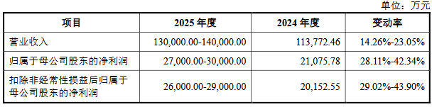 2025年,公司营业收入预计为13.00亿元至14.00亿元,同比增长幅度预计为14.26%至23.05%;归属于母公司股东的净利润预计为2.70亿元至3.00亿元,同比增长幅度预计为28.11%至42.34%;扣除非经常性损益后归属于母公司股东的净利润预计为2.60亿元至2.90亿元,同比增长幅度预计为29.02%至43.90%。