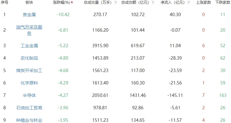 板块方面,电网设备、白酒、影视院线等板块涨幅居前,贵金属、油气开采及服务、工业金属等板块跌幅居前。