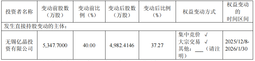 中国经济网北京2月2日讯 力芯微(688601.SH)日前披露关于持股5%以上股东权益变动触及1%刻度的提示性公告称,2026年1月30日,公司收到股东亿晶投资的通知,2025年12月8日至2026年1月30日,亿晶投资通过集中竞价方式减持公司股份979,000股,占公司股本的0.73%,通过大宗交易方式减持公司股份2,673,854股,占公司股本的2.00%。