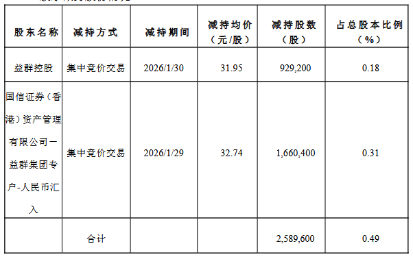 近日,公司接到股东益群控股出具的《关于权益变动触及1%及5%整数倍的告知函》《简式权益变动报告书》,获悉益群控股于2026年1月30日以集中竞价方式累计减持公司股份929,200股,占公司总股本比例0.18%,减持均价31.95元;“国信证券(香港)资产管理有限公司-益群集团专户-人民币汇入”为益群控股的一致行动人,于2026年1月29日以集中竞价方式减持1,660,400股,占公司总股本比例0.31%,减持均价32.74元。合计减持公司股份2,589,600股,根据减持均价计算,套现总金额约84,049,436元。其中,益群控股套现29,687,940元。