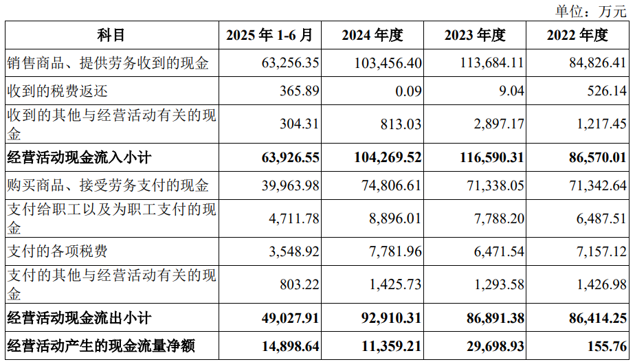 上述同期,公司销售商品、提供劳务收到的现金分别为84,826.41万元、113,684.11万元、103,456.40万元、63,256.35万元;经营活动现金流量净额分别为155.76万元、29,698.93万元、11,359.21万元和14,898.64万元。