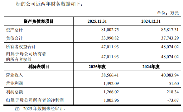 2024年度、2025年度,标的公司营业收入分别为40,083.94万元、38,566.41万元,归属于母公司所有者的净利润分别为-73.67万元、1,005.96万元。