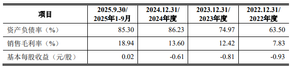 2022年末、2023年末、2024年末、2025年9月末,韩建河山资产负债率分别为63.50%、74.97%、86.23%、85.30%。