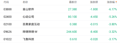 截至发稿,金山软件(03888.HK)跌6.17%、心动公司(02400.HK)跌5.26%、哔哩哔哩-W(09626.HK)跌3.32%。