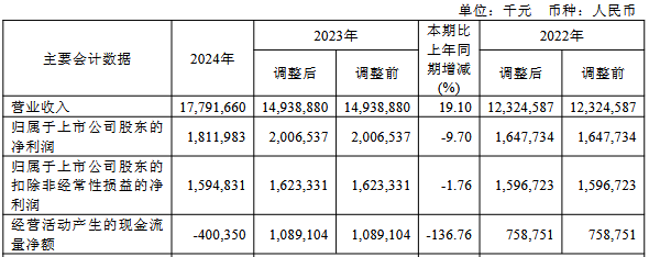 2023年至2024年,公司营业收入分别为149.39亿元、177.92亿元,归属于上市公司股东的净利润分别为20.07亿元、18.12亿元,归属于上市公司股东的扣除非经常性损益的净利润分别为16.23亿元、15.95亿元,经营活动产生的现金流量净额分别为10.89亿元、-4.00亿元。