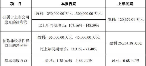 据公司2025年度业绩预告,公司预计归属于上市公司股东的净利润盈利250,000.00万元至300,000.00万元,比上年同期增长107.16%至148.59%,扣除非经常性损益后的净利润预计盈利35,000.00万元至45,000.00万元,比上年同期增长33.31%至71.40%。本期业绩预告是公司财务部门初步测算的结果,未经会计师事务所审计。