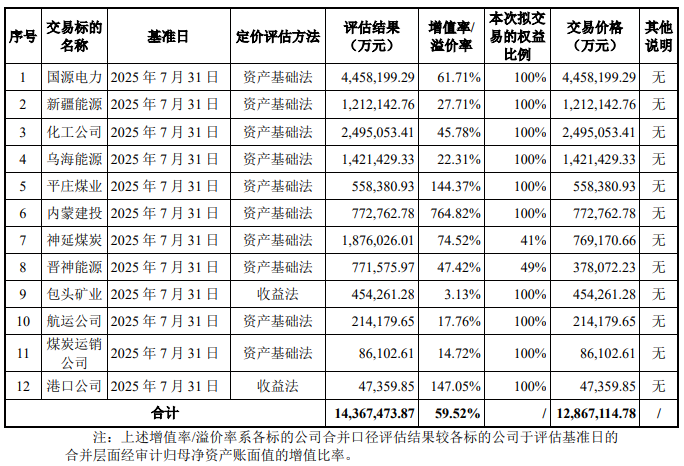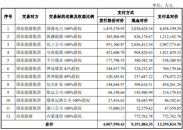 中国神华拟通过发行A股股份及支付现金的方式购买国家能源集团持有的国源电力100%股权、新疆能源100%股权、化工公司100%股权、乌海能源100%股权、平庄煤业100%股权、神延煤炭41%股权、晋神能源49%股权、包头矿业100%股权、航运公司100%股权、煤炭运销公司100%股权、港口公司100%股权,并以支付现金的方式购买西部能源持有的内蒙建投100%股权。