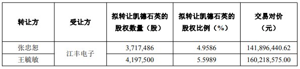 据江丰电子公告,为深化产业结构布局,顺应半导体零部件行业未来发展趋势及满足区域市场需求,进一步增强公司核心竞争力,江丰电子及其全资子公司宁波江丰博鑫科技有限公司(以下简称“江丰博鑫”)担任执行事务合伙人的宁波甬金智享企业管理咨询合伙企业(有限合伙)(以下简称“宁波甬金”,江丰电子与宁波甬金合称为“受让方”)拟以现金人民币59,070.47万元协议收购张忠恕、王毓敏、张凯轩、北京德益诚投资发展中心(有限合伙)(以下简称“德益诚”)、北京英凯石英投资发展中心(有限合伙)(以下简称“英凯石英”,张忠恕、王毓敏、张凯轩、德益诚与英凯石英合称为“转让方”)合计持有的北京凯德石英股份有限公司(以下简称“凯德石英”或“标的公司”)15,475,627股股份(以下称为“标的股份”),占凯德石英的股权比例为20.6424%。本次交易标的股份的每股转让价格为38.17元。