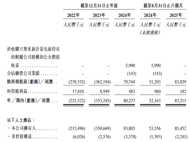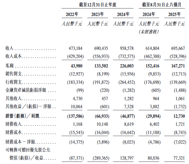 2022年、2023年、2024年12月31日止年度以及截至2024年及2025年8月31日止八个月,公司的收入分别约为人民币473.2百万元、人民币690.4百万元、人民币958.6百万元、人民币614.8百万元及人民币695.7百万元,净亏损/净利润分别约为人民币-221.5百万元、人民币-353.2百万元、人民币80.2百万元、人民币52.2百万元及人民币83.2百万元。