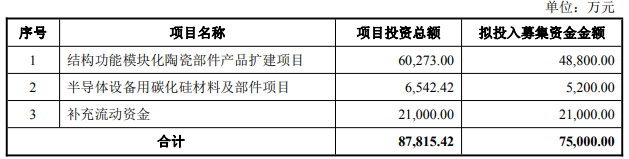 珂玛科技2026年1月26日披露的向不特定对象发行可转换公司债券募集说明书显示,公司本次向不特定对象发行可转债拟募集资金总额不超过人民币75,000.00万元(含75,000.00万元),扣除发行费用后,将全部投资于以下项目:结构功能模块化陶瓷部件产品扩建项目、半导体设备用碳化硅材料及部件项目、补充流动资金。