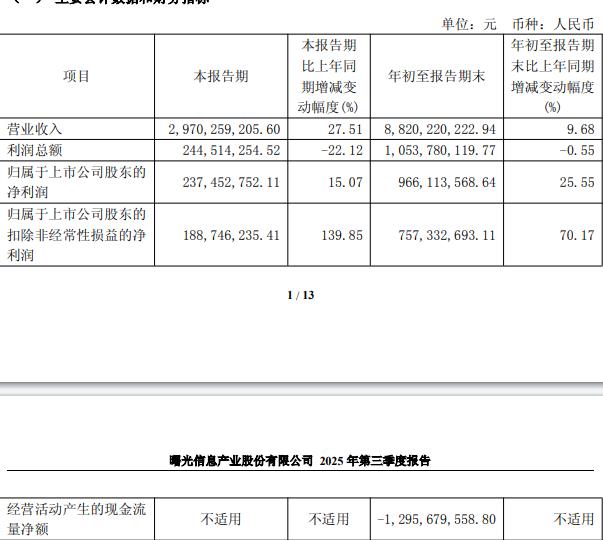 据公司2025年第三季度报告,本报告期,公司实现营业收入29.70亿元,同比增长27.51%;归属于上市公司股东的净利润2.37亿元,同比增长15.07%;扣除非经常性损益后的净利润1.89亿元,同比增长139.85%。