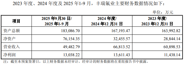 2023年度、2024年度、2025年1-9月,丰瑞氟业营业收入分别为60,898.53万元、66,813.52万元、49,482.79万元,净利润分别为11,438.14万元、13,611.43万元、13,038.22万元。