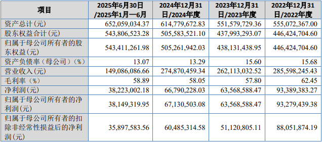 2022年度、2023年度、2024年度和2025年1-6月,公司的营业收入分别为28,559.82万元、26,211.30万元、27,487.05万元和14,908.61万元;净利润分别为9,338.94万元、6,356.86万元、6,679.02万元和3,822.30万元;归属于母公司所有者的净利润分别为9,327.94万元、6,356.86万元、6,713.05万元和3814.93万元;扣除非经常性损益后归属于母公司股东的净利润分别为8,805.19万元、5,112.08万元、6,048.53万元和3,589.76万元。