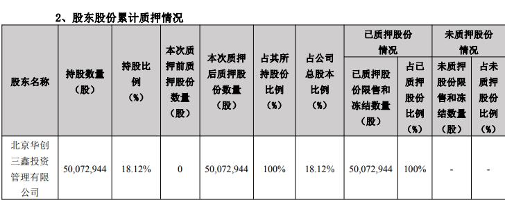 公司2025年12月6日披露关于控股股东股份质押的公告,截至公告日,公司控股股东华创三鑫直接持有公司股份50,072,944股,占公司总股本的18.12%。本次质押后,华创三鑫累计质押股份为50,072,944股,占其所持股份比例的100%,占公司总股本比例的18.12%。