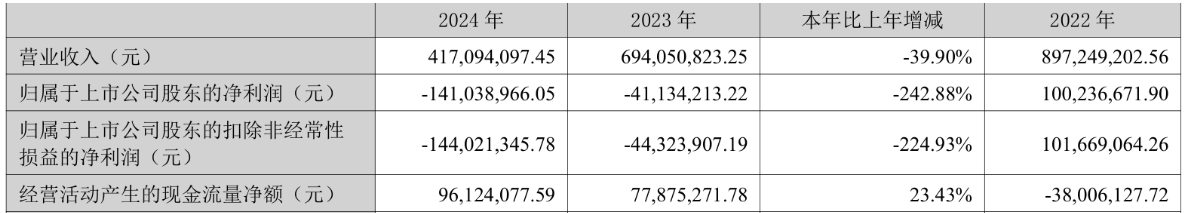 2024年,公司实现营业收入4.17亿元,同比下降39.90%;归属于上市公司股东的净利润为-1.41亿元,上年同期为-4113.42万元;归属于上市公司股东的扣非净利润为-1.44亿元,上年同期为-4432.39万元;经营活动产生的现金流量净额为9612.41万元,同比增长23.43%。