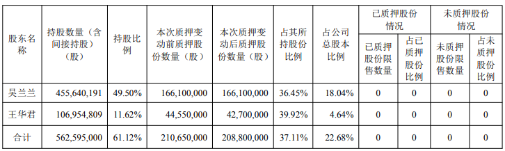 裕同科技2026年1月13日披露的关于公司控股股东股份质押变动的公告显示,吴兰兰、王华君持股数量(含间接持股)为562,595,000股,持股比例为61.12%,本次质押变动后质押股份数量为208,800,000股,占其所持股份比例的37.11%,占公司总股本比例的22.68%。
