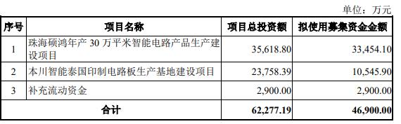 本川智能2月2日发布的向不特定对象发行可转换公司债券募集说明书(上会稿)显示,公司本次发行可转债拟募集资金总额不超过46,900.00万元(含46,900.00万元),扣除发行费用后,募集资金净额拟投资于以下项目:珠海硕鸿年产30万平米智能电路产品生产建设项目、本川智能泰国印制电路板生产基地建设项目、补充流动资金。