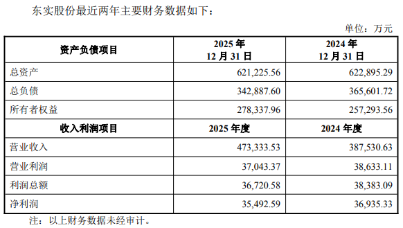 2024年度、2025年度,东实股份营业收入分别为387,530.63万元、473,333.53万元,净利润分别为36,935.33万元、35,492.59万元。