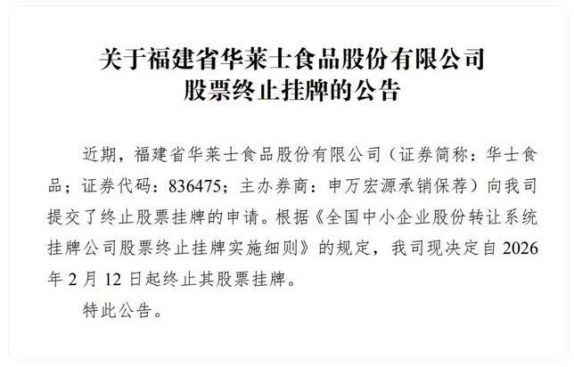 2月12日,华莱士母公司华士食品正式终止在新三板挂牌。