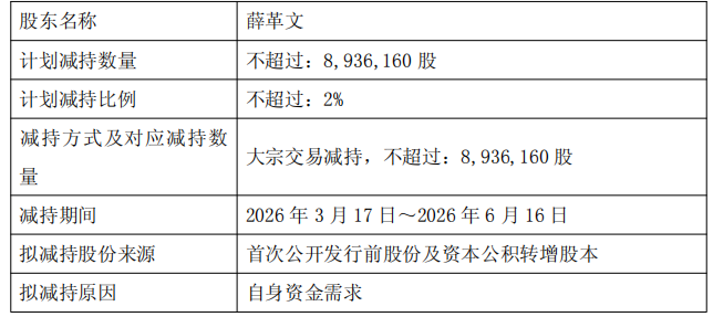公司控股股东薛革文计划在公告之日起15个交易日后的3个月内(即2026年3月17日至2026年6月16日)通过大宗交易方式减持公司股份不超过8,936,160股(即不超过公司总股本的2%)。