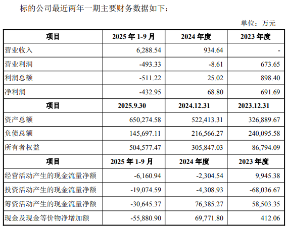 2023年度、2024年度、2025年1-9月,标的公司营业收入分别为0元、934.64万元、6,288.54万元,净利润分别为691.69万元、68.80万元、-432.95万元,经营活动产生的现金流量净额分别为9,945.38万元、-2,304.54万元、-6,160.94万元。