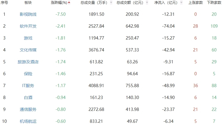 板块方面,油气开采及服务、贵金属、农化制品等板块涨幅居前,影视院线、软件开发、游戏等板块跌幅居前。