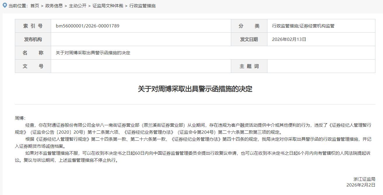 江苏证监局网站2025年12月17日发布对陈炯采取出具警示函行政监管措施的决定。经查,陈炯在财通证券无锡永乐路证券营业部从业期间,存在在微信群中提供、传播误导客户的信息,未向客户充分提示证券交易的风险、操作客户账户等行为,违反了《证券公司和证券投资基金管理公司合规管理办法》(证监会令第166号)第十条第二款,《证券经纪人管理暂行规定》(证监会公告〔2020〕20号)第十一条、第十二条第一项、第二项以及第二十六条第一款的规定。根据《证券公司和证券投资基金管理公司合规管理办法》第三十二条第一款,《证券经纪人管理暂行规定》第二十四条、第二十六条第一款规定,江苏证监局决定对陈炯采取出具警示函的行政监管措施,并记入证券期货市场诚信档案。
