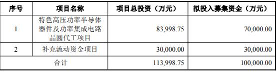 本次向特定投资者发行A股股票募集资金总额不超过100,000.00万元(含本数),在扣除发行费用后将用于特色高压功率半导体器件及功率集成电路晶圆代工项目、补充流动资金项目。