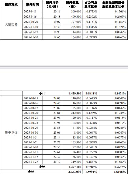 公司2025年11月28日披露关于持股5%以上股东权益变动触及1%整数倍暨减持计划实施完毕的公告,公司于2025年8月7日披露关于公司控股股东、实际控制人及董事、副总经理股份减持计划的预披露公告,公司董事、副总经理易仰卿持有公司16,416,971股(占公司总股本的9.5936%,占公司当时剔除已回购股份后总股本数量的9.6617%)的股份,计划自公告披露之日起15个交易日后的3个月内通过集中竞价和/或大宗交易的方式减持公司股份合计不超过3,398,300股,即不超过剔除公司回购专用账户的股份数量后的总股本的2%。近日,公司收到易仰卿出具的告知函,自2025年9月11日起至2025年11月27日减持期间,易仰卿通过大宗交易方式累计减持公司股份1,439,300股,通过集中竞价方式累计减持公司股份1,297,700股,合计减持公司股份2,737,000股,截至公告日,本次减持计划期限已届满,本次减持计划已实施完毕。经计算,易仰卿共套现60550651元。