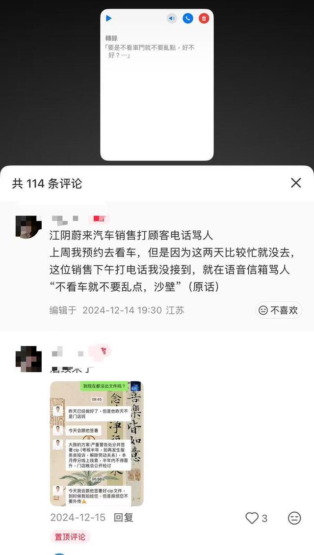 事实上,这类极端言行并非孤例。2024年12月,江苏江阴的一名蔚来销售就因客户未能按约看车,在语音信箱中留下了带有辱骂词汇的留言。在那起事件中,博主最终通过投诉渠道拿到了蔚来内部的处罚文件,显示涉事销售被处以严重警告,并签署了为期半年的CIP考核协议,其间不仅停发线上线索、不得晋升,还需在门店公开检讨。