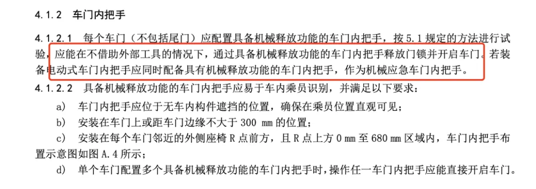 新国标规定每个车门应配备至少一个机械释放车门内把手,且独立操作任一车门内把手应能够开启对应车门。