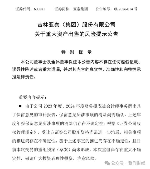 此后亚泰集团月月发布交易进展公告,但始终没有取得实质性突破。直到2026年2月14日,这则重大资产出售风险提示公告发布,才向市场承认这场被亚泰集团视为“回血救命”的股权交易,在推进了近两年后仍因多重不确定性深陷僵局。