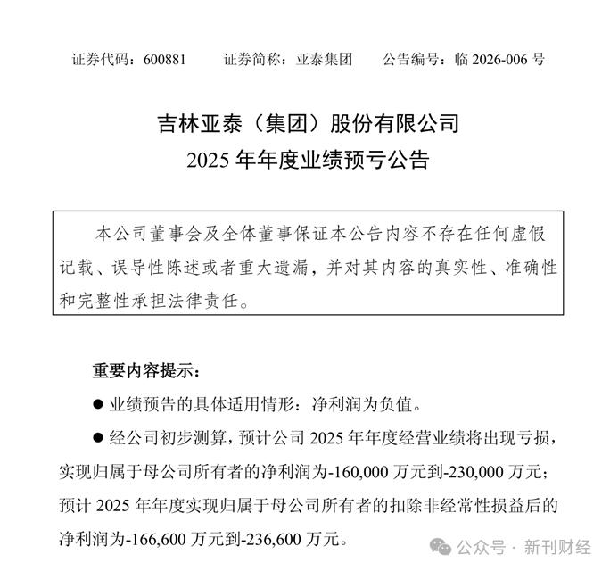在2024年便谋划出售东北证券股权这一核心资产,足见亚泰集团的财务状况早已不乐观。但其2026年1月发布的业绩预告还是引发了广泛关注——公司2025年全年预计亏损16亿元至23亿元。水泥与房地产两项核心主业双双亏损,再加上大额资产减值计提,迫使这家昔日的区域多元化经营巨头急于加快出售核心资产以回笼资金。