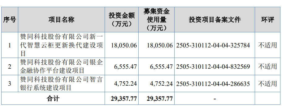 赞同科技原拟募集资金29,357.77万元,用于赞同科技股份有限公司新一代智慧云柜更新换代建设项目、赞同科技股份有限公司银企金融协作平台建设项目、赞同科技股份有限公司智言银行系统建设项目。