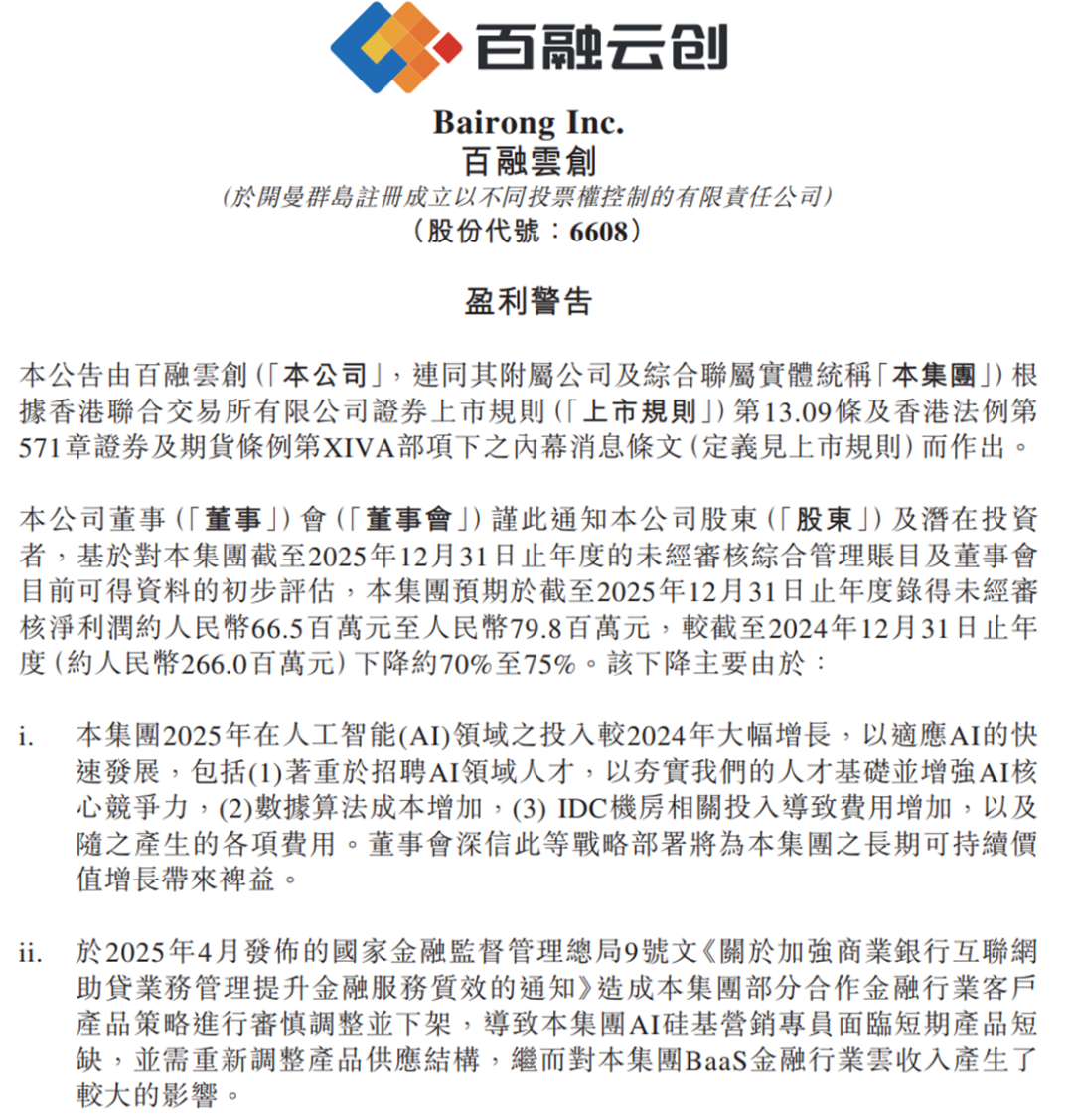 2月26日,百融云创发布盈利警告,根据初步评估,预计2025年度未经审核净利润约6650万元至7980万元,较2024年同期的2.66亿元下降约70%至75%。