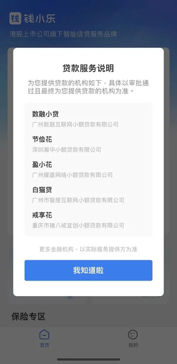 钱小乐App显示,其贷款服务合作机构包括深圳瀚华小额贷款有限公司、广州耀盛网络小额贷款有限公司、广州市智度互联网小额贷款有限公司、重庆市猪八戒宜创小额贷款有限公司等。