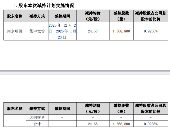 南京明凯2025年12月2日至2026年1月23日以集中竞价方式减持4368800股,减持均价为24.58元/股。以此计算,南京明凯共计套现107385104元。