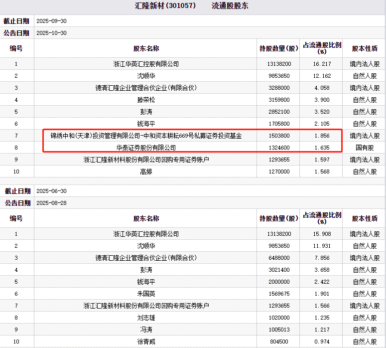 对比汇隆新材2025年三季报和2025年半年度报告发现,锦绣中和(天津)投资管理有限公司-中和资本耕耘669号私募证券投资基金、华泰证券股份有限公司新晋公司前十大流通股股东,持股数量分别为1503800股、1324600股,占流通股比例的1.856%、1.635%。
