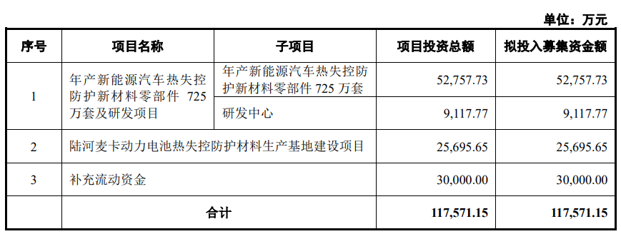 固德电材本次发行募集资金总额为120,060.00万元,扣除发行费用后募集资金净额为108,182.60万元,比原计划少9,388.55万元。固德电材2026年3月3日披露的招股书显示,公司拟募资117,571.15万元,用于年产新能源汽车热失控防护新材料零部件725万套及研发项目、陆河麦卡动力电池热失控防护材料生产基地建设项目、补充流动资金。