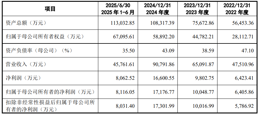 2022年至2025年1-6月,固德电材的营业收入分别为47,510.96万元、65,091.87万元、90,791.86万元、45,761.61万元;净利润分别为6,423.41万元、9,802.75万元、16,600.55万元、8,062.52万元;归属于母公司所有者的净利润分别为6,405.86万元、10,048.77万元、17,176.77万元、8,116.05万元;扣除非经常性损益后归属于母公司所有者的净利润分别为5,786.92万元、10,016.99万元、17,301.99万元、8,031.40万元。