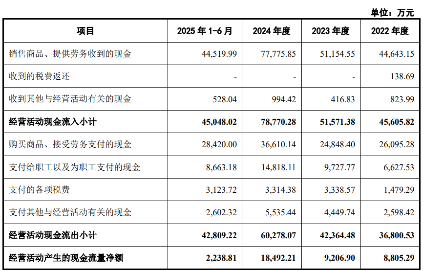 上述同期,公司销售商品、提供劳务收到的现金分别为44,643.15万元、51,154.55万元、77,775.85万元、44,519.99万元;经营活动产生的现金流量净额分别为8,805.29万元、9,206.90万元、18,492.21万元、2,238.81万元。
