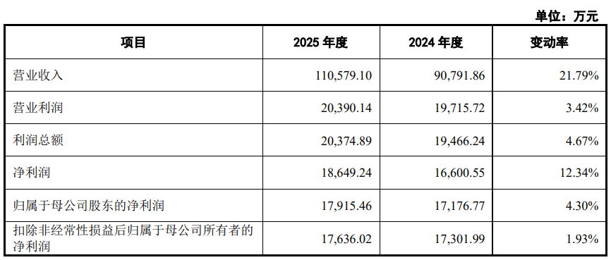 2025年全年,固德电材的业收入为110,579.10万元,同比变动21.79%;净利润为18,649.24万元,同比变动12.34%;归属于母公司股东的净利润为17,915.46万元,同比变动4.30%;扣除非经常性损益后归属于母公司所有者的净利润为17,636.02万元,同比变动1.93%。