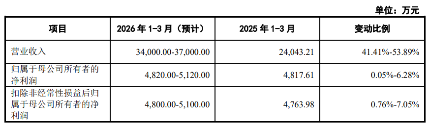 2026年1-3月,公司预计实现营业收入34,000.00万元至37,000.00万元,同比增长41.41%至53.89%;预计归属于母公司所有者的净利润为4,820.00万元至5,120.00万元,同比增长0.05%至6.28%;预计扣除非经常性损益后归属于母公司所有者的净利润为4,800.00万元至5,100.00万元,同比增长0.76%至7.05%。