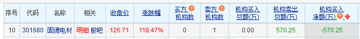 龙虎榜数据显示,卖出固德电材金额最大的前5名中,1家为机构专用席位。经统计,机构席位今日卖出固德电材净额为570.25万元。